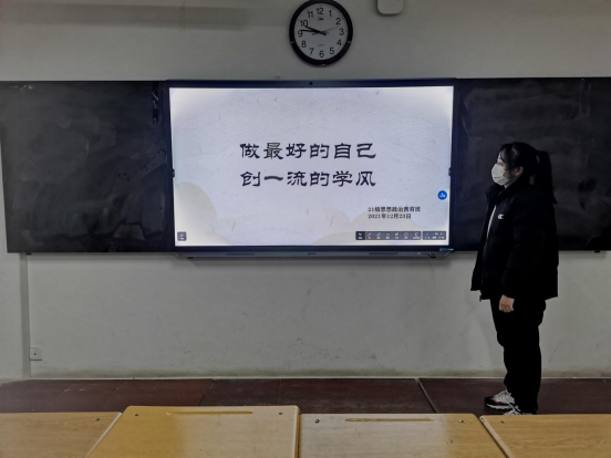 为进一步加强学风建设,帮助同学们掌握良好的学习方法,更好地学习专业知识,提高自身的竞争力,为接下来的期末考试做好准备。21级思想政治教育班于2021年12月23日晚自习在3-302召开了“做最好的自己,创一流的学风”主题教育班会。本次班会由班主任任玥老师主持,21级思想政治教育班全体同学参加。